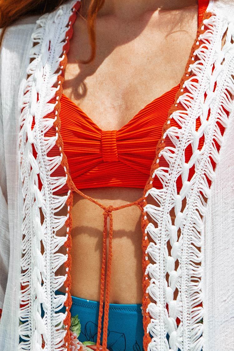 Looking for a flirty alternative to a basic cardigan? Check out this June Contrast Crochet Trim Kimono Cover Up. The front and sleeve edges are accented with crochet trim for a textural contrast.